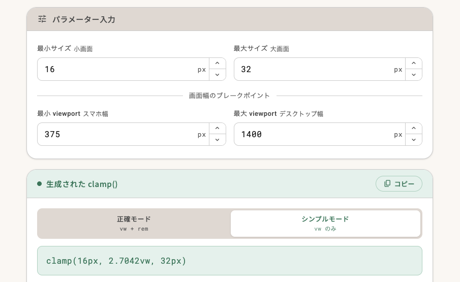 スマホの基準となる画面幅(例:375px)とデスクトップの基準となる画面幅(例:1400px)を指定します。 - モードを選択して生成された clamp() をコピーします。